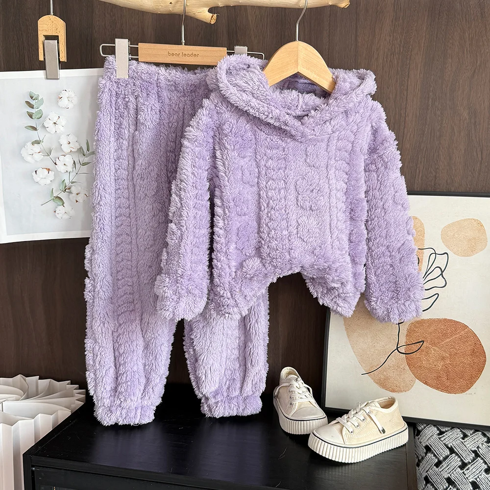 This cozy 2-piece set is perfect for baby girls aged 3-7 years. The set includes a plush jacquard top and matching pants. Made from soft, breathable fabric gentle on delicate skin. Lightweight yet warm, ideal for autumn and winter wear. Comfortable fit allows freedom of movement for active children. Suitable for indoor play, lounging, or casual home wear. Easy to put on and take off for parents. Durable stitching ensures long-lasting wear. Stylish purple color adds a charming and fashionable touch. A practical and comfortable addition to any child’s home wardrobe.