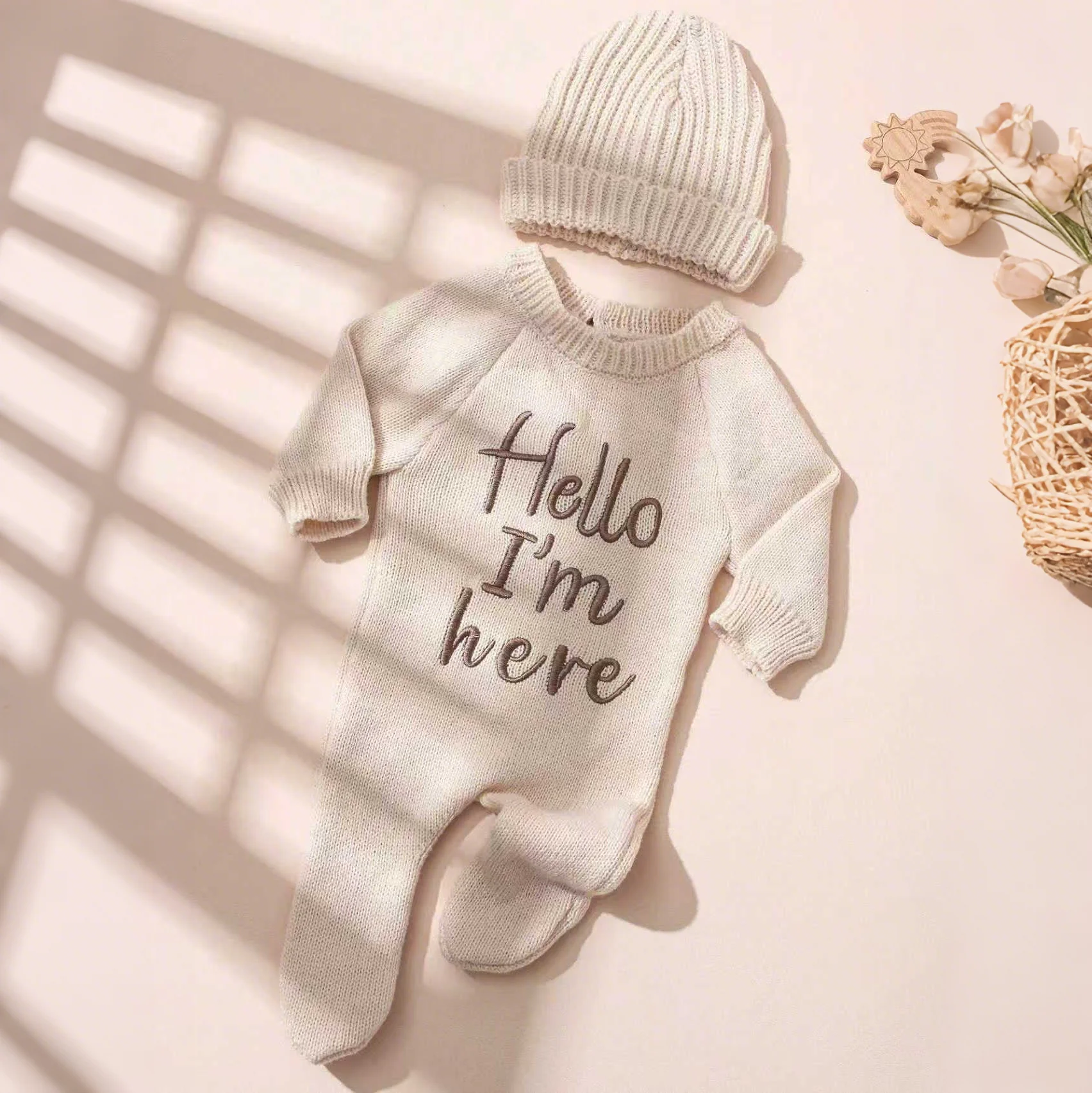 This adorable footed jumpsuit is perfect for newborns’ birth announcements or photoshoots. Features soft knitting with “Hello” embroidery for a cute, stylish look. Made from gentle, breathable fabric suitable for delicate baby skin. Full-body design with enclosed feet keeps babies warm and cozy. Lightweight yet comfortable, ideal for newborn photography or hospital coming-home outfit. Easy to put on and take off for parents. Suitable for both baby boys and girls. Durable stitching ensures long-lasting wear. Soft and gentle, perfect for a newborn’s sensitive skin. A charming and practical addition to any newborn’s wardrobe.