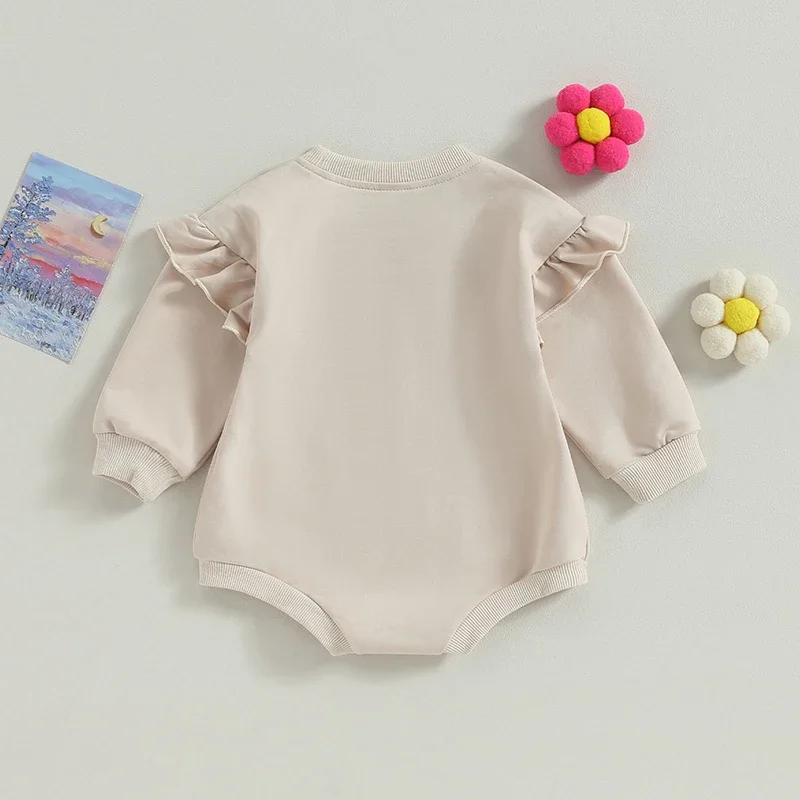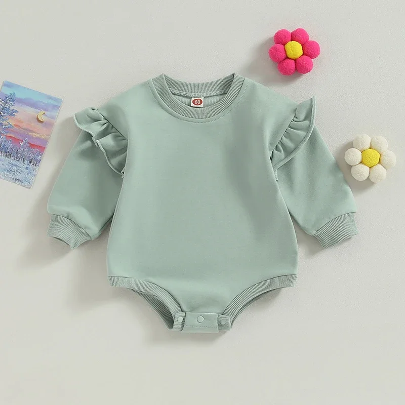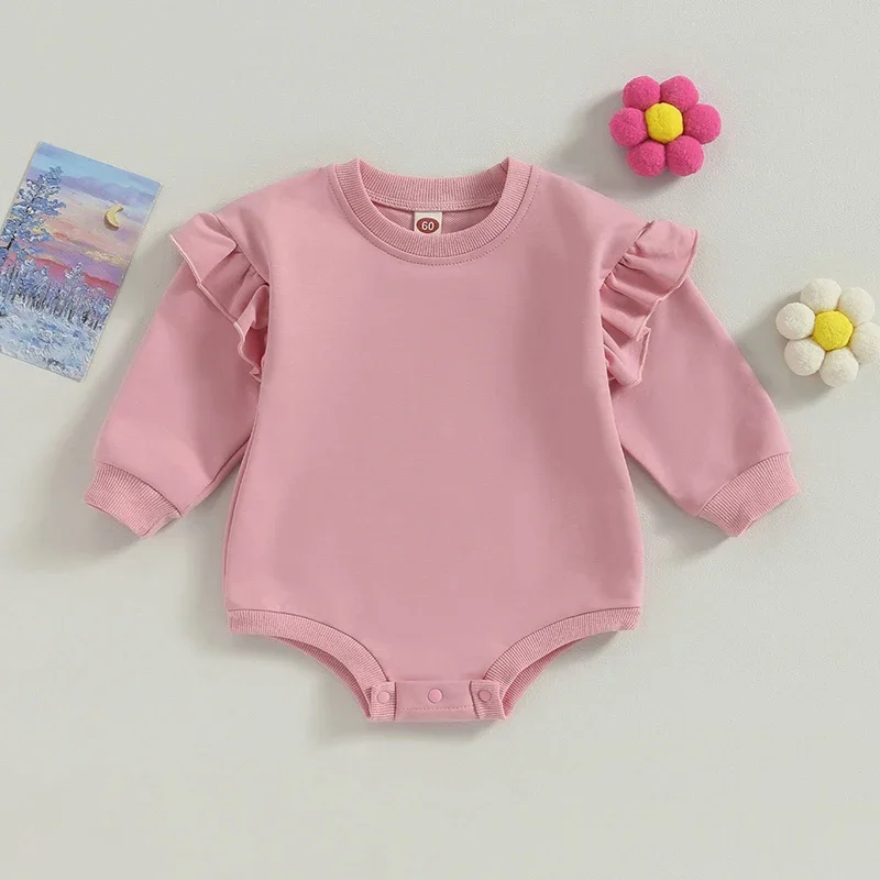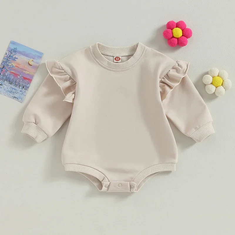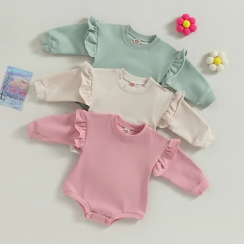 This adorable baby romper is perfect for keeping little ones cozy in the fall. The soft sweatshirt fabric offers warmth without feeling heavy. Ruffled long sleeves add a sweet and stylish touch. Its solid color design makes it easy to pair with accessories. The round neck provides a classic and comfortable fit. Snaps at the bottom allow for easy diaper changes. Gentle on delicate skin and ideal for daily wear. Durable stitching ensures long-lasting quality. Perfect for outings, playtime, or photo moments. A charming and practical addition to any infant’s fall wardrobe.